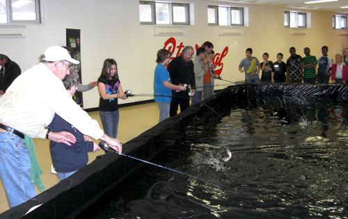 Depuis 2011, la Fondation pour la sauvegarde de la truite mouchetée (FSTM) organise annuellement une activité de pêche tout à fait originale appelée « Happening de pêche » dans la salle du Patro Laval.