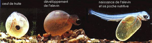 Les oeufs fécondés se développent ensuite lentement pour devenir des alevins. Au moment de l'éclosion de l'oeuf, l'alevin possède sa poche nutritive (sac vitellin) qui permet de le nourrir pendant le développement de ses autres organes (bouche, estomac, nageoires, etc.).